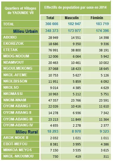 Au moment du 3ème Recensement Général de la Population et de l'Habitat (3èRGPH) en 2005, la commune Yaoundé 7ème n'était pas encore crée. Heureusement, le plan directeur d'urbanisme de Yaoundé à l'horizon 2020, commandé par la communauté urbaine de Yaoundé donne la répartition de la population par arrondissement en 2020 suivante :