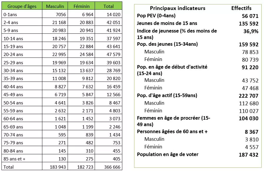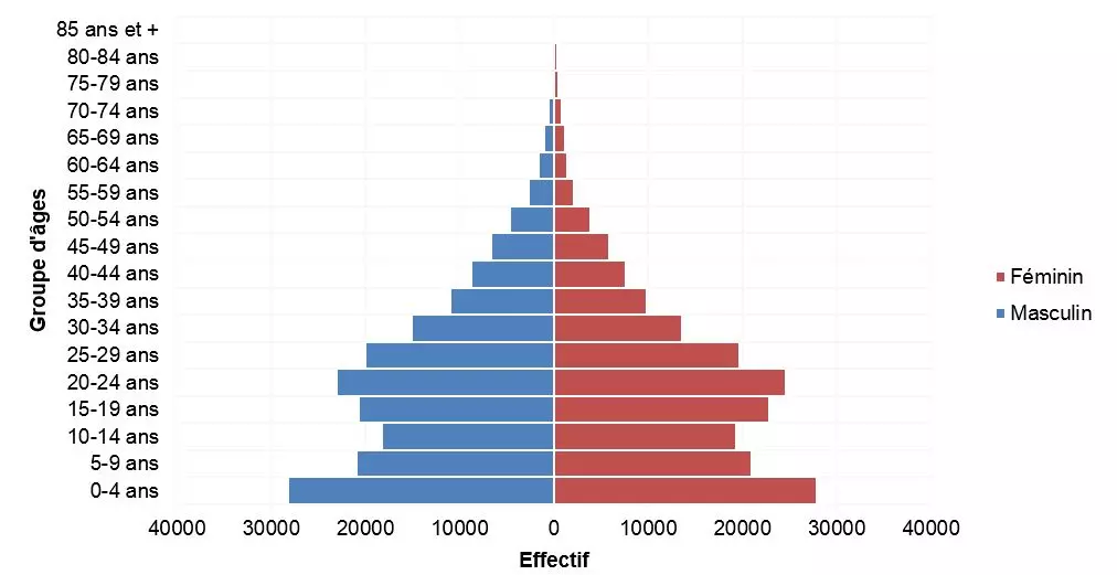 Une population caractérisée par une extrême jeunesse. L’âge médian étant de 18 ans dans l’ensemble de la population, 18,3 ans chez les femmes et 17,1 ans chez les hommes.